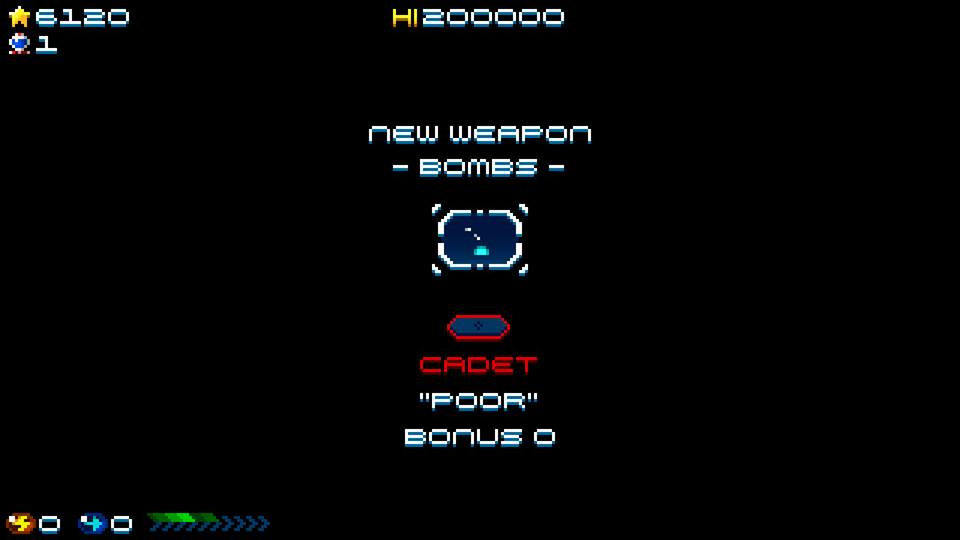 The gameplay is what you would expect from a game in the realm of Gradius, R-Type, or U.N. Squadron – good ole side-scrolling shooter action. There are various different weapons to unlock as you progress through the levels—one day, I am sure I will get them all myself—that you can select to mix and customize for your arsenal for each level. The stages split off into different paths that you can choose, rather than a forced linear progression, which is nice. It gives you a bit of variety too, especially if you are stuck on a particular stage and can’t beat it, though all of the stages are pretty difficult, so it’s not really any easier either way you choose to go. There is also an easy mode, for folks like me who aren’t good enough to select “pilot” as the difficulty.