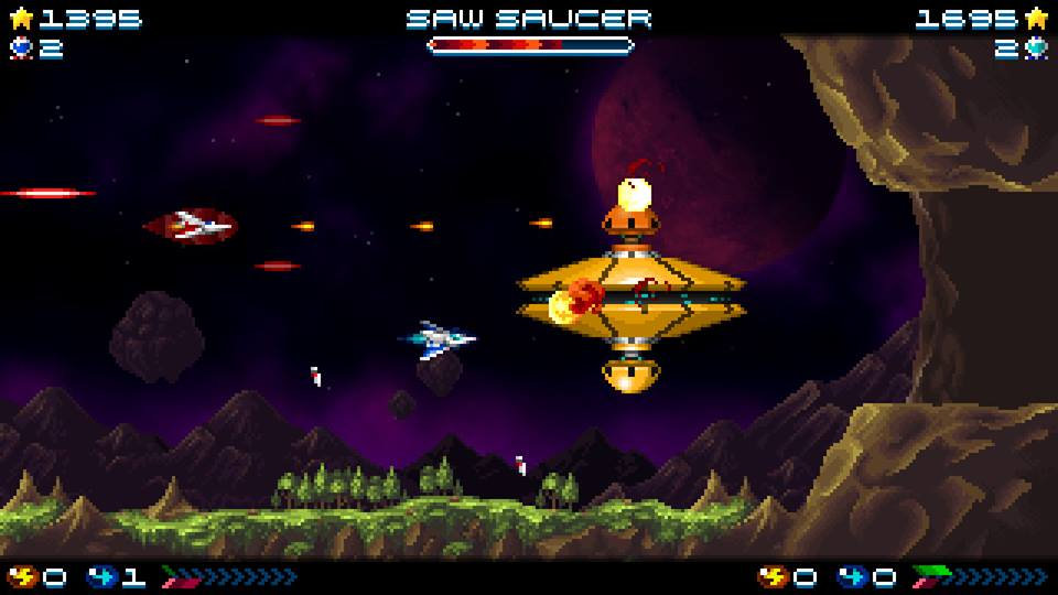 The controls stand out to me in Super Hydorah. They are incredibly responsive, nice and forgiving for the most part, and overall very intuitive. I may die a lot, but I cannot blame it on the controller for this one! In addition, the weapons fire with a nice speed, and the power ups are very useful, ranging from double-firing, to having remote turrets flying around behind you, firing at the enemies.