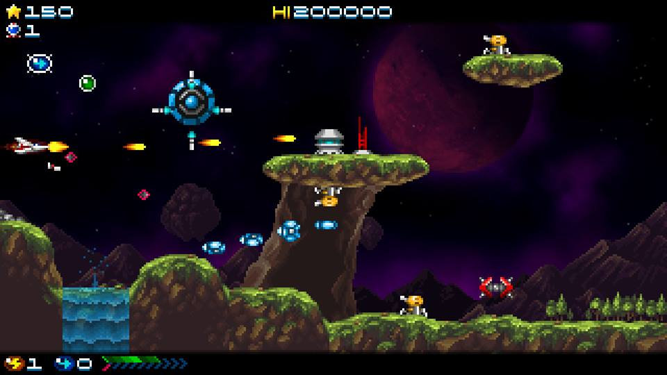 This is another retro-style throwback game, this time to the tune of the wonderful and oh-so-nostalgic 16-bit era—one of my personal favorites for this genre! The graphics, while retro in style, have a touch of modern styling, and the overall aesthetic of the stages and the enemies is very pleasing. The sounds are a throwback to a simpler time as well, but again with a touch of modern polishing. This game very successfully captures everything I love about the 90s and shooters. It looks just as great in handheld—and controls just as well—as it does on the big screen.