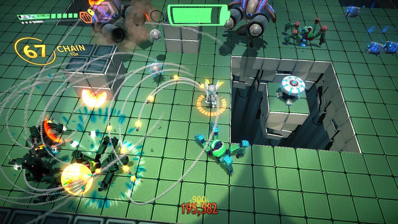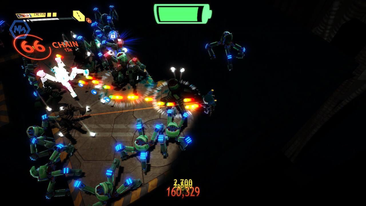 Right away I noticed that the controls were made so anyone could pick up, play, and get right into the action. You move with the left stick and aim with the right. The right bumper is your primary weapon, and left bumper is the secondary more powerful weapon. When you choose the secondary, it will overheat and automatically switch back to the primary weapon, and you can switch back once it cools off. Rather than the normal life bar, you have a battery that you must maintain by picking up tiny batteries that fallen enemies will drop randomly when you destroy them. If you let the battery drain completely, you die. While battling, in addition to the battery meter, you also have a knocked down meter that allows you throw caution to the wind a bit and be reckless, as you can get hit a few times before you’re knocked down and stripped of any power ups or upgrades. The meter will also reset after a while of just battling and avoiding shots.