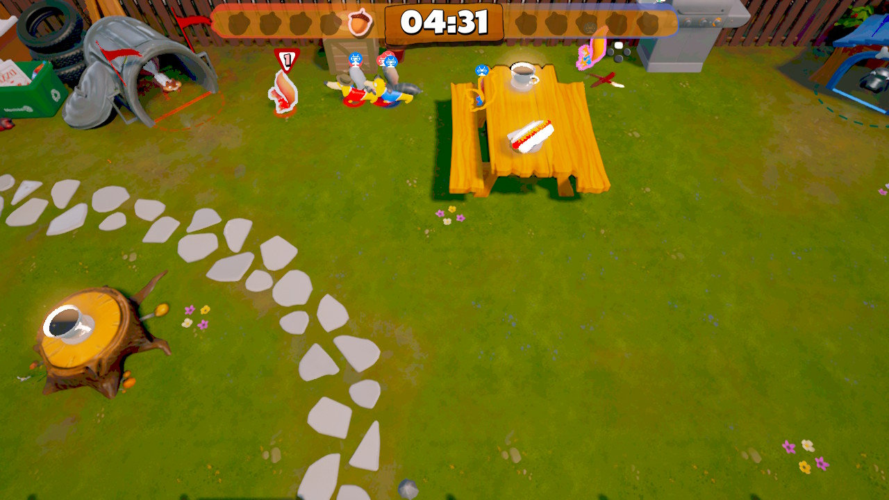 The third game type doesn’t use acorns at all, and is instead just a battle royale mode where everyone starts off with three balloons. You lose one balloon every time you get punched, and you’re knocked out of the round if you lose all three balloons. The last team standing wins the round, and again, five rounds wins the game. This mode was the hardest mode for me to get into; if you have eight players at once on the screen, it is really difficult to track the action, or your own character more specifically. Now, this is true of every game mode, but when you’re chasing the nuts you actually only need to track your character and one acorn at a time. In the battle royale, you need to actually be a little aware of where everyone on the screen is, and given that the screen is zoomed out so you see pretty much the whole arena, characters are small and hard to differentiate. There is a little badge over your head identifying your character, but that badge exists for everyone playing with you, too, so… yeah, the screen gets pretty busy and hard to read.