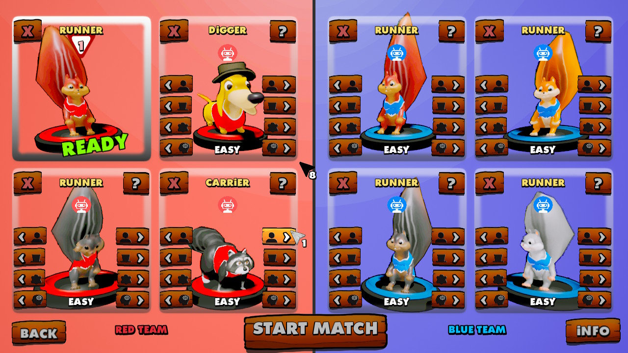 The second game type, thief, sees five acorns being dropped at the beginning of the match. Whoever has the most acorns after the round is over wins. What makes this even more fun is that you can actually steal acorns from your opponent’s base, making it, it my view, the most strategic and most fun mode. Balancing offense and defense becomes much more of a focus in thief, and I really liked the extra layer of strategy on top of what was mostly a frenzied action experience.